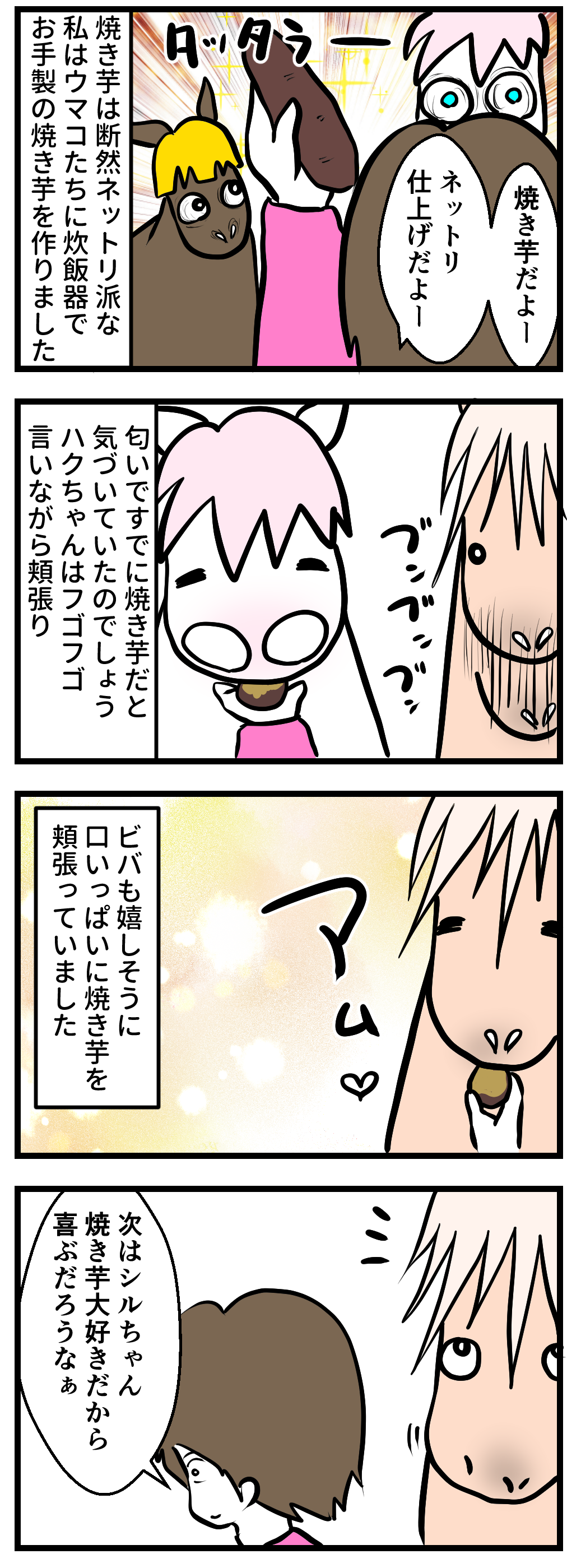 2022年12月15日 ねっとりとホクホクどっちがお好き? 朝にはなくなってた炊飯器でねっとり焼き芋を作りには水3合で玄米炊きホクホクさせるには水1合で白米炊きGoogleさんにそう書いてあったので、ねっとりを作ってみたのですが、ハクちゃん以外には不評でした。できてすぐに出さなかったので水を含んでしまったのか、まだ温かったので違和感を感じたのか。。。あんなに大好きなのに、手作りした途端不評で凹みました。なので次はリベンジでホクホクに炊いてみようと思います。 「馬とごはん」カテゴリの最新記事