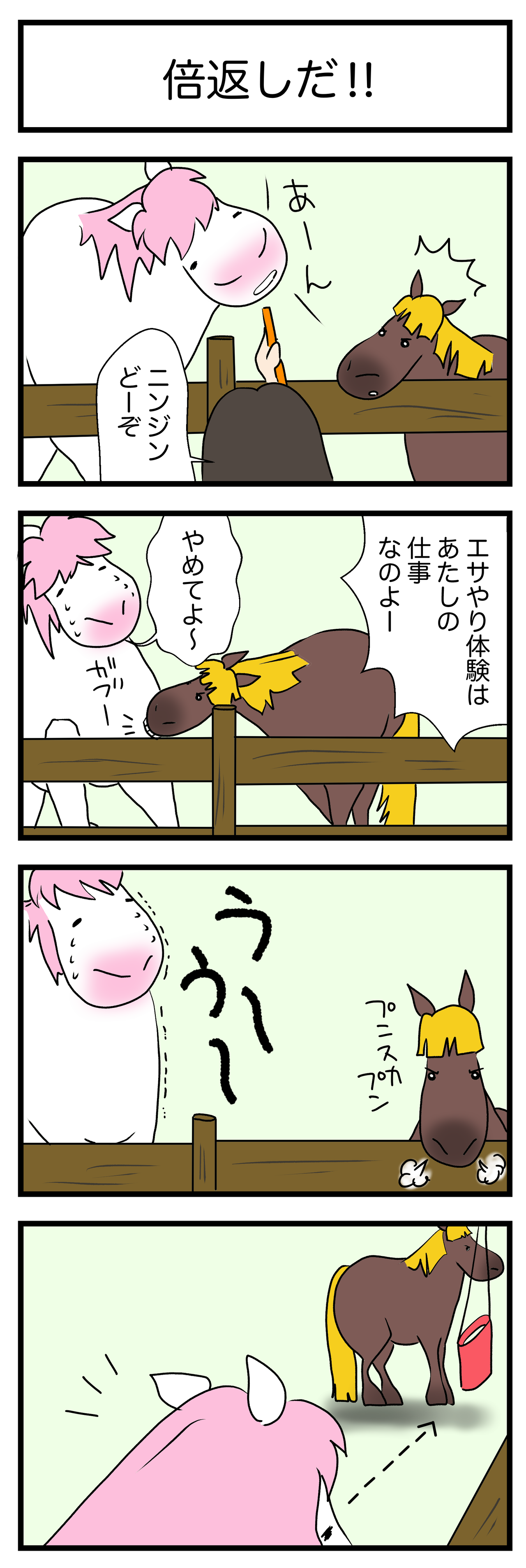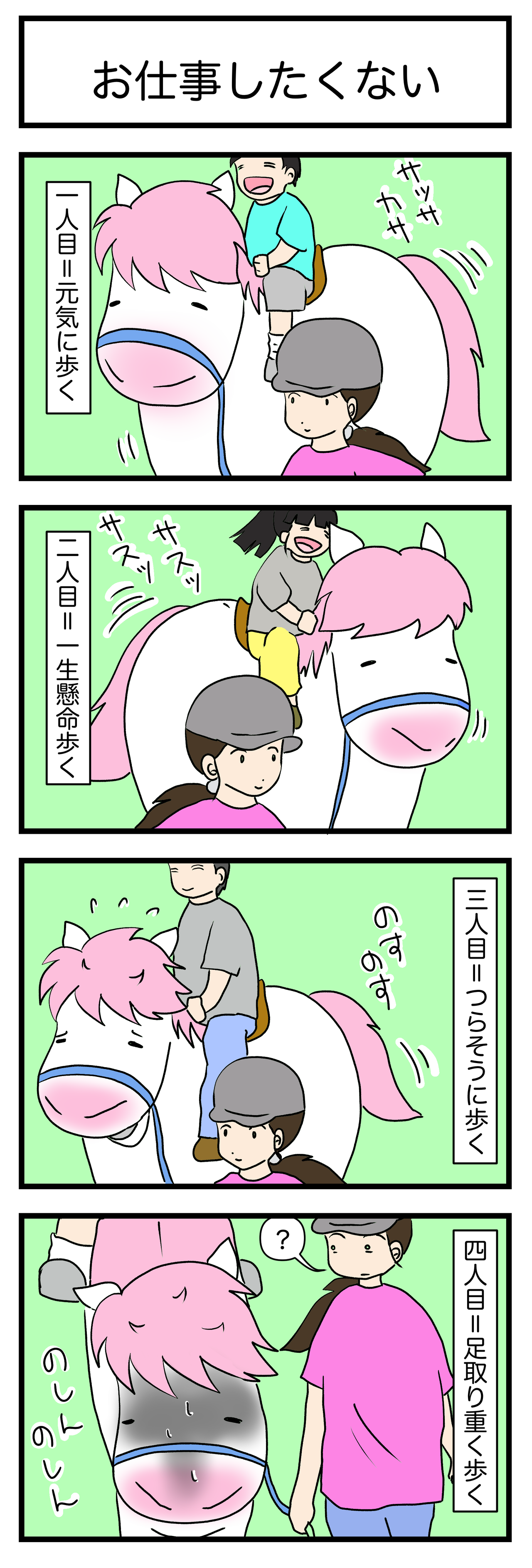 文句も言わず人間と一緒に一生懸命にひき馬乗馬のお仕事をこなすビバとは正反対で、数人乗せただけで大仕事をこなしたような表情になり、この世の終わりのような顔で歩くではないでしょうか。