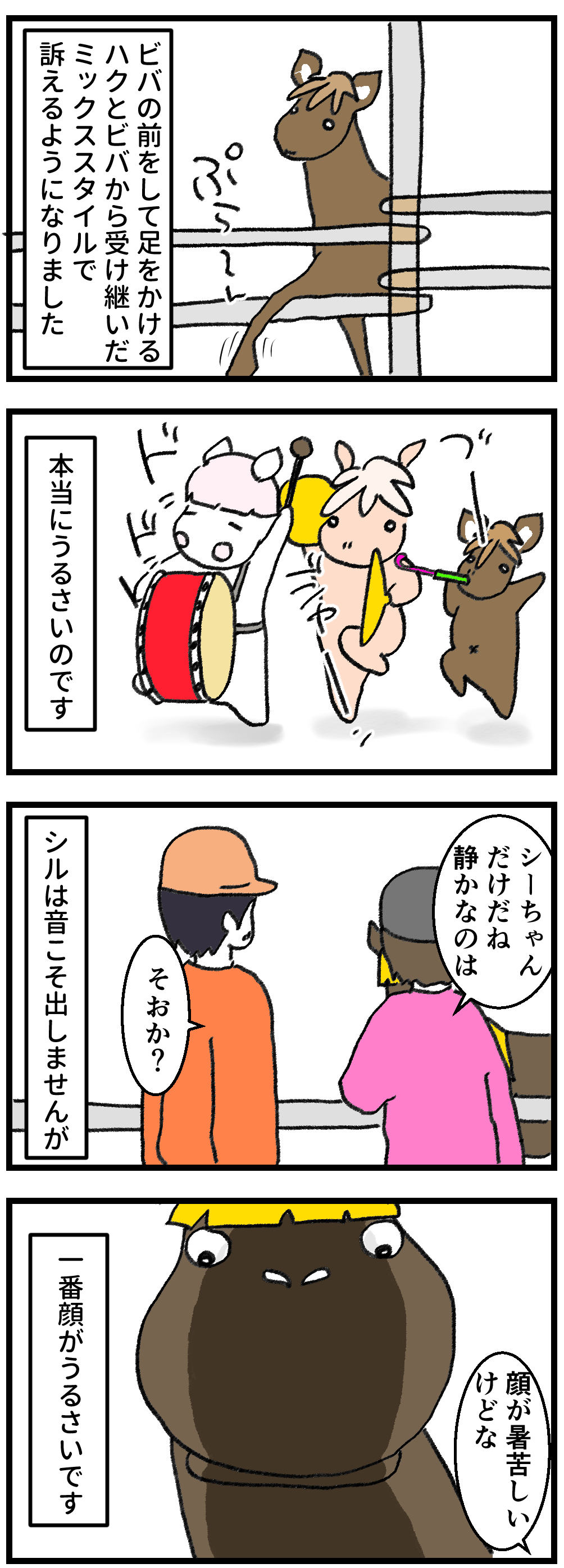 2025年12月30日 ウマコたちの主張 声は大きい、物を使って音を出す。よそではきっと桶を振り回して尾を出すコもいることでしょう。どうにかして人間を思うがままに動かそうと音を出しますが、我が家ではボスの「うるさい」というひと言で片付けられています。それを知っているからでしょうか。白目を剥いている顔を見なければ、シルは本当に静かな女のコです。