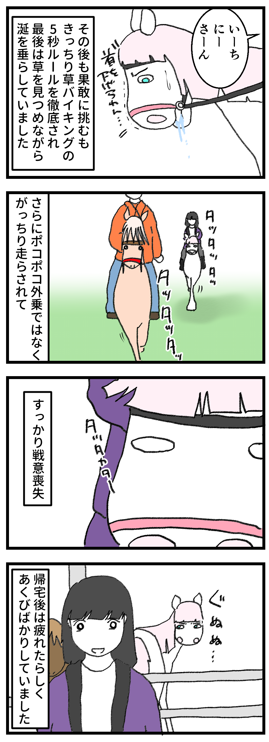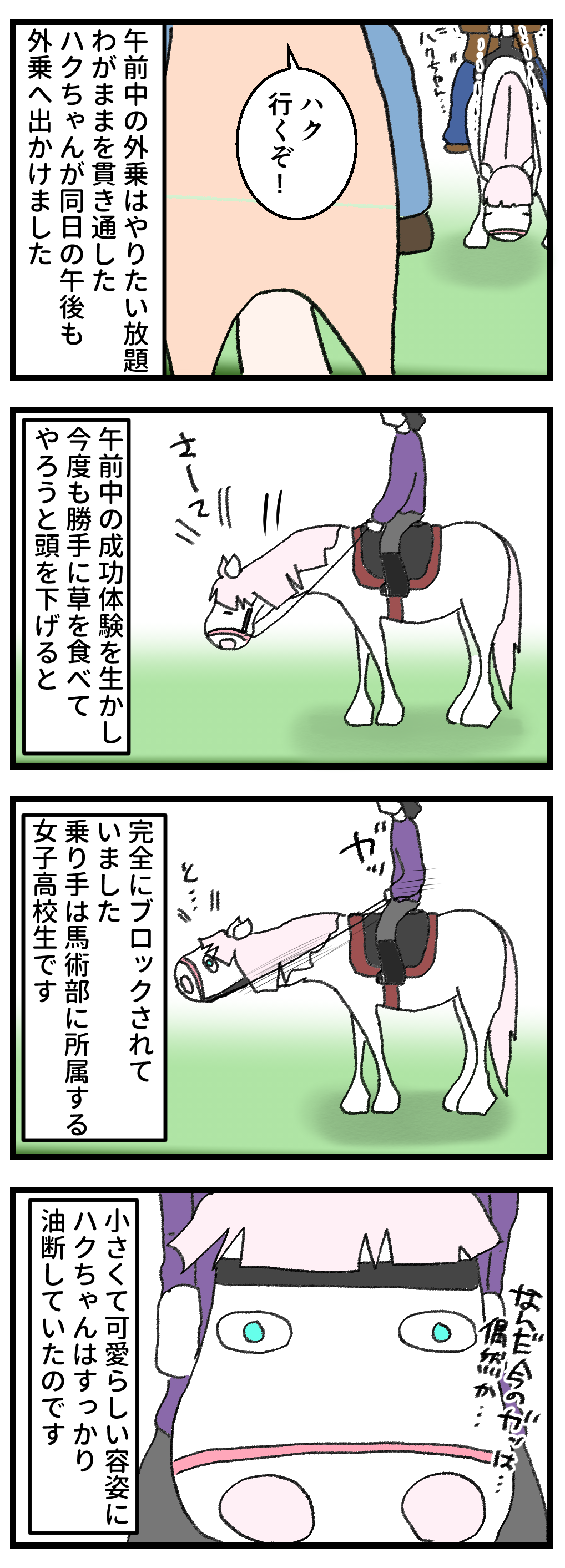2025年12月28日 我が道を行く白力王の戦い 本来やるべきことです雨が降り続きどうなることかと思いきや、この週末も気持ちよく晴れました(寒いけど)。なので連日お客さんを乗せて外乗やらレッスンやら、ウマコたちもフル稼働。そんな中、初めてうちに来た女子高校生を舐めにかかった白力王は、見事に返り討ちにあっていました。身長140センチくらいの可愛らしい女の子ですが、反射神経はさすがなもの。ハクの容赦ない首下げをちゃんと阻止していました。ハクちゃんはもちろん、終始納得のいかない顔で走っていました。今日もレッスン。がんばろうね。