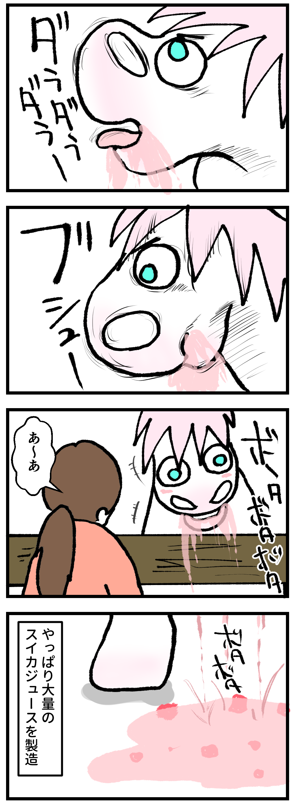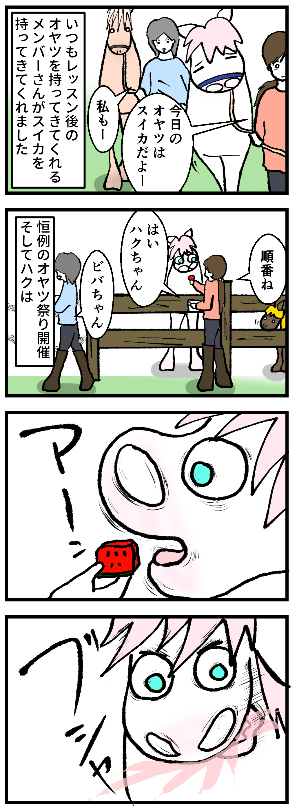 2023年07月31日 馬の食べ方にも個性がある クチャラーさん口を閉じて食べなさいと何度言ってもダメなんです。キョロキョロよそ見もしながら食べるため、ハクちゃんの前だけスイカジュースの池が出来上がります。スイカだけでなく、ほかの食べ物でも顔のありえない場所に食べカスがついていたり、桶に入れてあるはずが大量に床に落ちていたりと大騒ぎ。人間だったらかなりお行儀の悪い部類に入る、ハクちゃんの食べ方なのでした。。。 「 ハク」カテゴリの最新記事