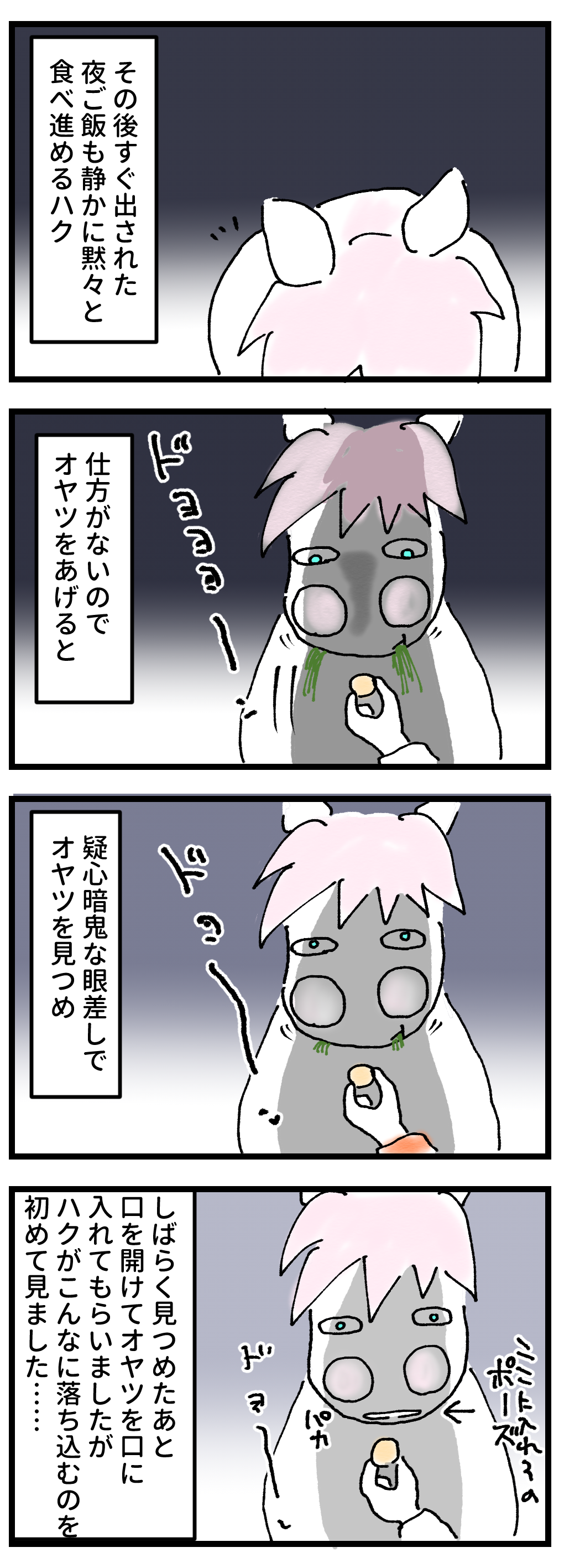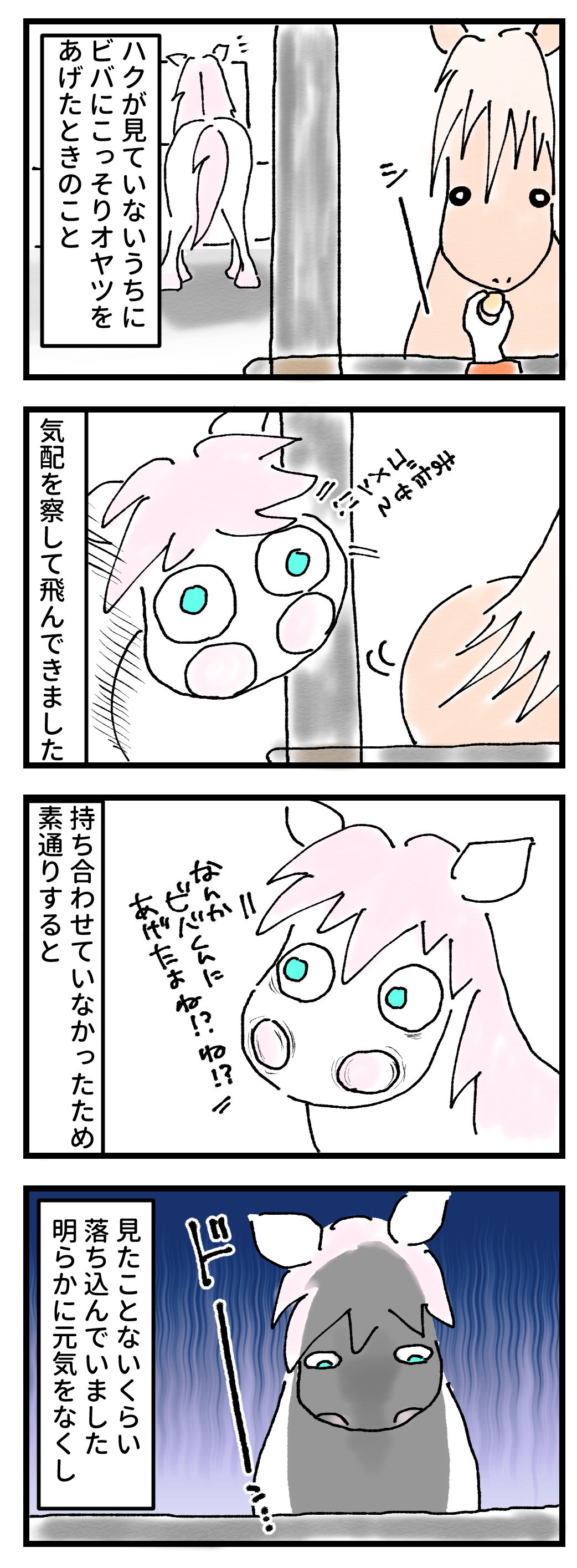 2024年11月13日 馬も落ち込むことがある ビバだけズルい部屋の真後ろでお尻を向けていたはずなのに、なぜかバレたこっそりオヤツ。見ていて気の毒になるくらい元気をなくしていました……。その後すぐみんなでオヤツを食べたのですが、ショックを引きずっていたのか、最後まで元気のないハクちゃんでした……。 「 ハク」カテゴリの最新記事
