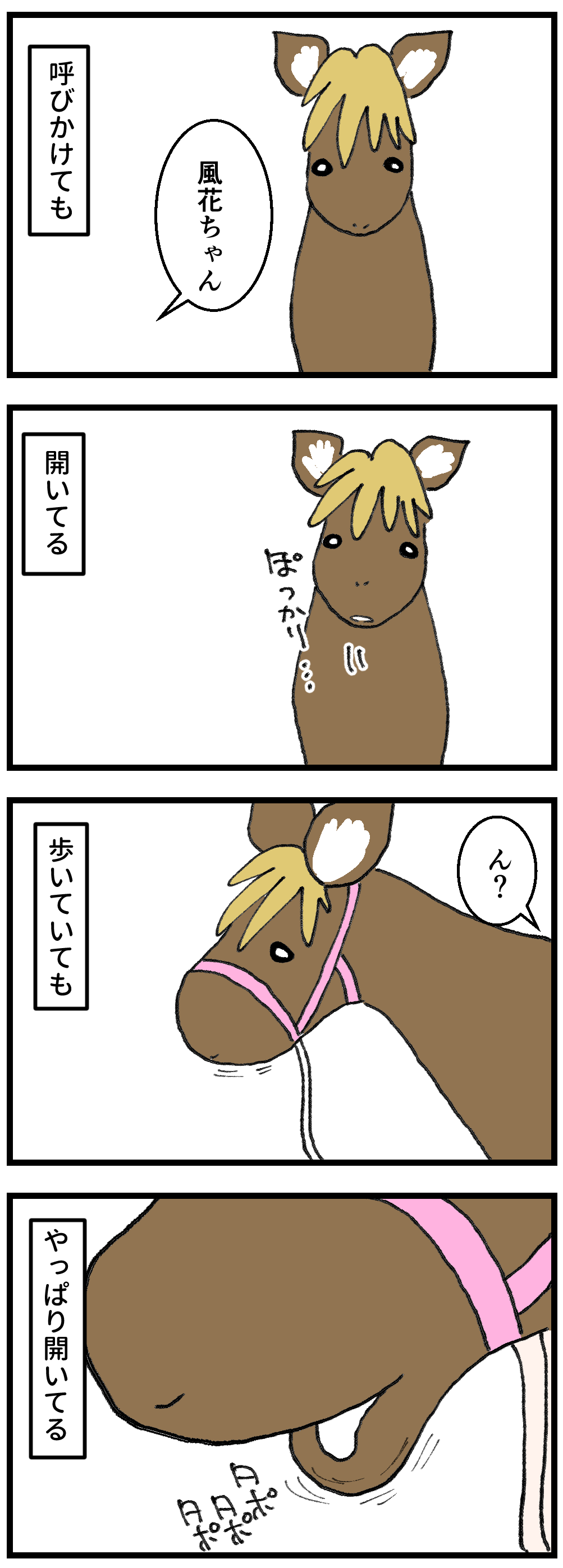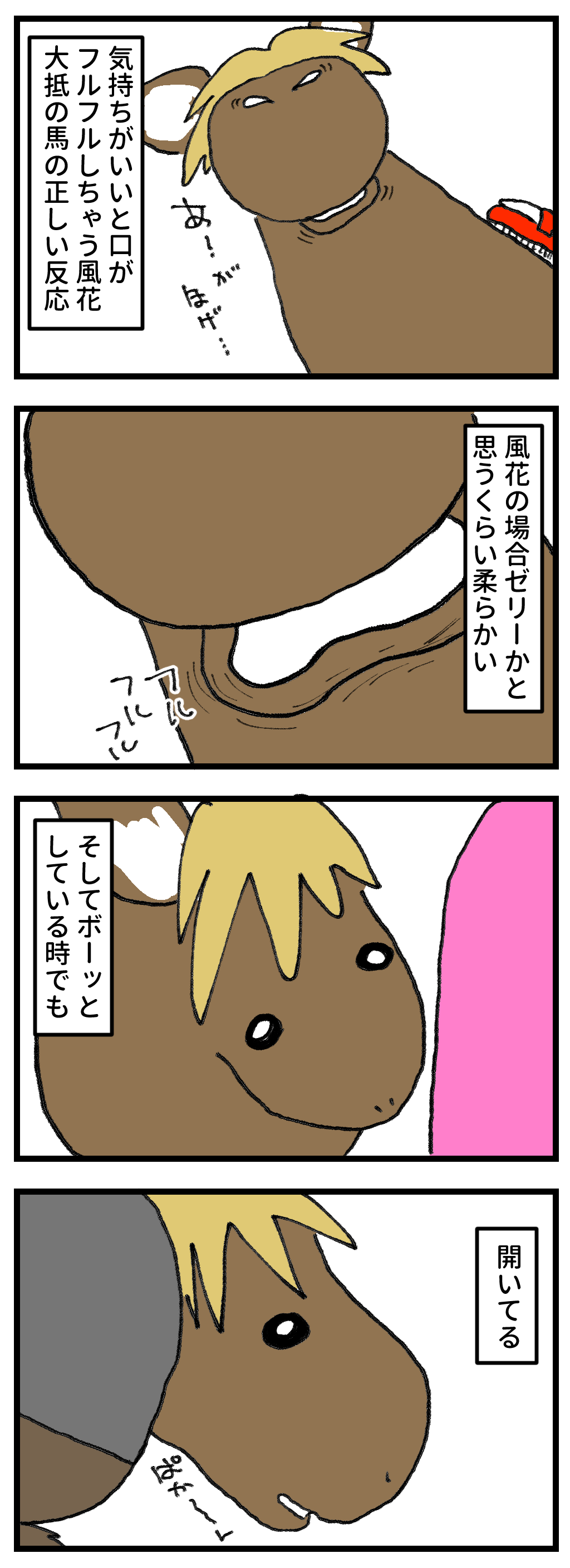 2025年05月14日 馬がリラックスしている時 緩い?美少女顔の風花ですがなぜか結構な確率で口が開いています。ボスに怒られると下唇をかみしめてムーというくちになるのですが、そのほかは開き気味。子供だからリラックスしている時が多いのか、それとも性格的なものなのか。歩きながら下唇がタポタポしているのを見た時は、少し心配にもなりました(笑 「風花」カテゴリの最新記事