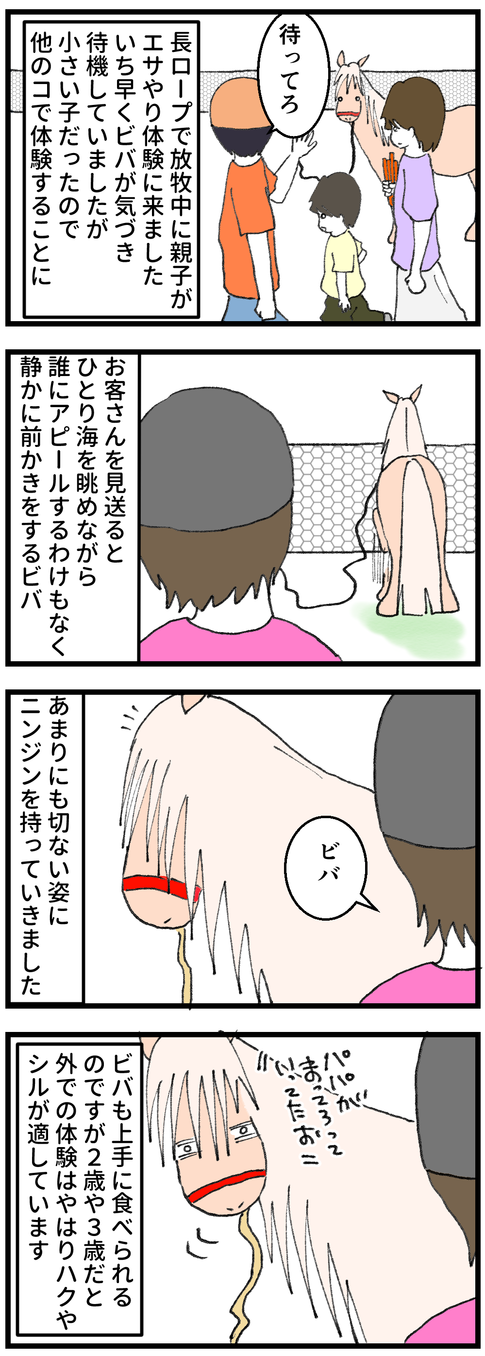 2025年06月08日 この9年でみんな食べ方が上手になりました 欲深王……外でのエサやり体験では、ヨチヨチ歩きの子供や抱っこされたままの子供には、安定のハクとシルにエサやり体験係をしてもらっています。となるといつもしょんぼりしてしまうのが、やはりビバたん。ボスがビバ用にニンジンを必ず持っていますが、私もこっそりあげにいくので心のフォローはできているかと。平日や週末の閉園間際は比較的外にいることが多いので、外でのふれあいに来てくださいね。 「馬と仕事」カテゴリの最新記事