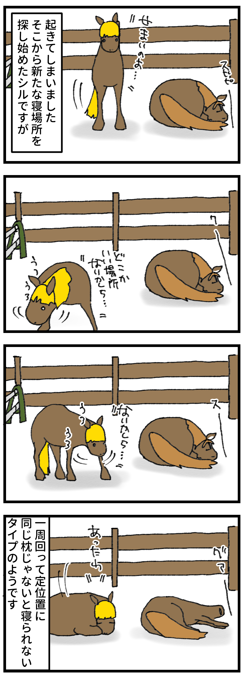 2025年07月11日 シルのこだわり いつもと一緒トイレの場所も寝る場所もほぼほぼ決まっているシル。その隙間で居心地のいい場所を探す風花。結局まだ牧場での同居は続いています。もう少し風花が大きくなるまではこのまま同居予定。 「馬の気持ち」カテゴリの最新記事
