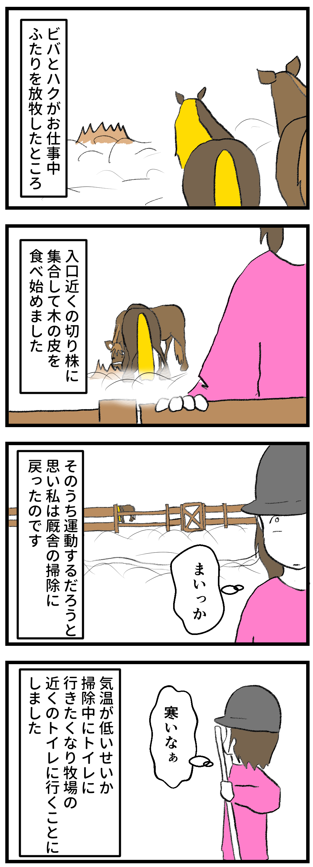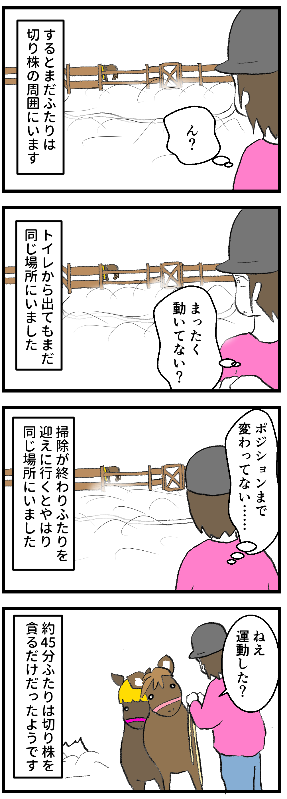 2026年02月10日 シルと風花の運動会 なにこれ……どれだけ運動しないのか……。シルもこの日は運動の気分ではなかったみたいで、ふたりしてまったく移動せずにひたすら切り株をかじるだけという放牧になりました。帰りはお昼ご飯が待っているので、とても元気よく歩いていました……。