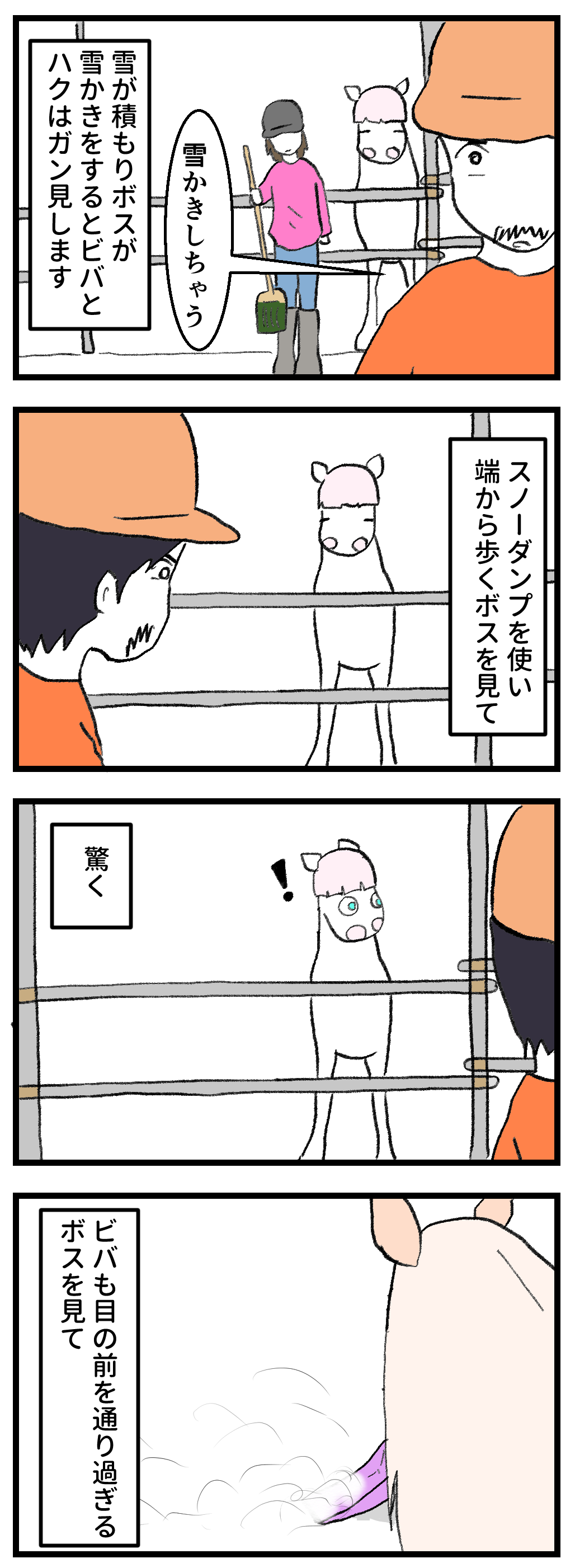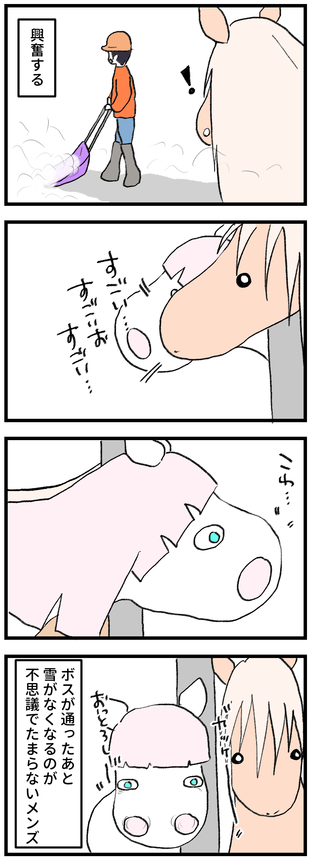 2026年02月12日 馬は人が使う道具を認識しているのだろうか 興味津々素手で木の板を割ったり(亀裂が入っていた)、足蹴りで木を折ったり(中が空洞になっていた)、たびたびゴリラーマンに変身する鬼を見ているメンズは、雪かきはどんな魔法を使っているのかと思っているのかもしれません。こういうとき不思議なんですが、やはり気にするのはメンズ。なんででしょうね?