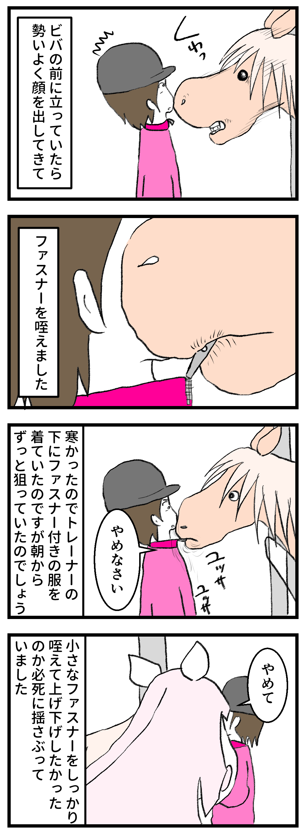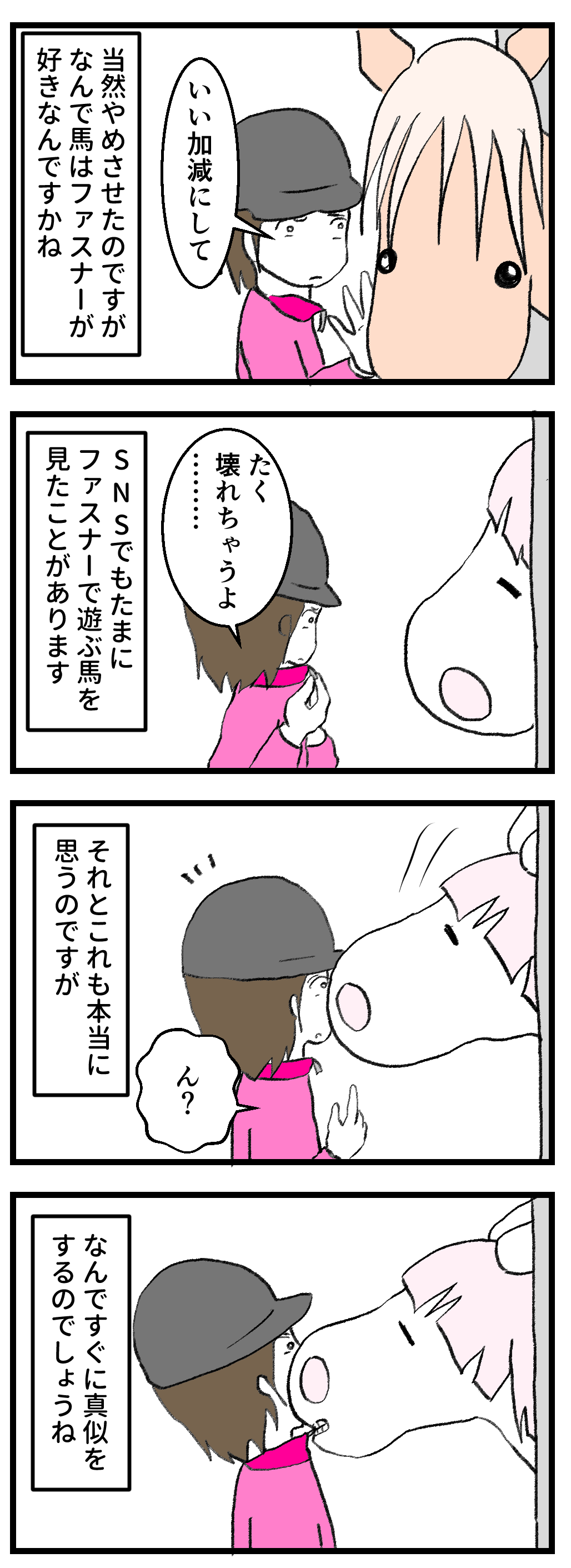 2026年02月04日 馬あるある? 馬あるある馬の口は本当に器用で、たくさんある草の中から食べられるもの、食べられないものをちゃんと分けて食べるのです。そしてどんな小さなものでも上手に食べることができます。なのでファスナーを咥えるなんてなんてことないのでしょうが、なんで馬はファスナーが好きなのか……。でも不思議とこのようなイタズラをするのは我が家ではメンズだけなんです。よそはどうなんでしょう?