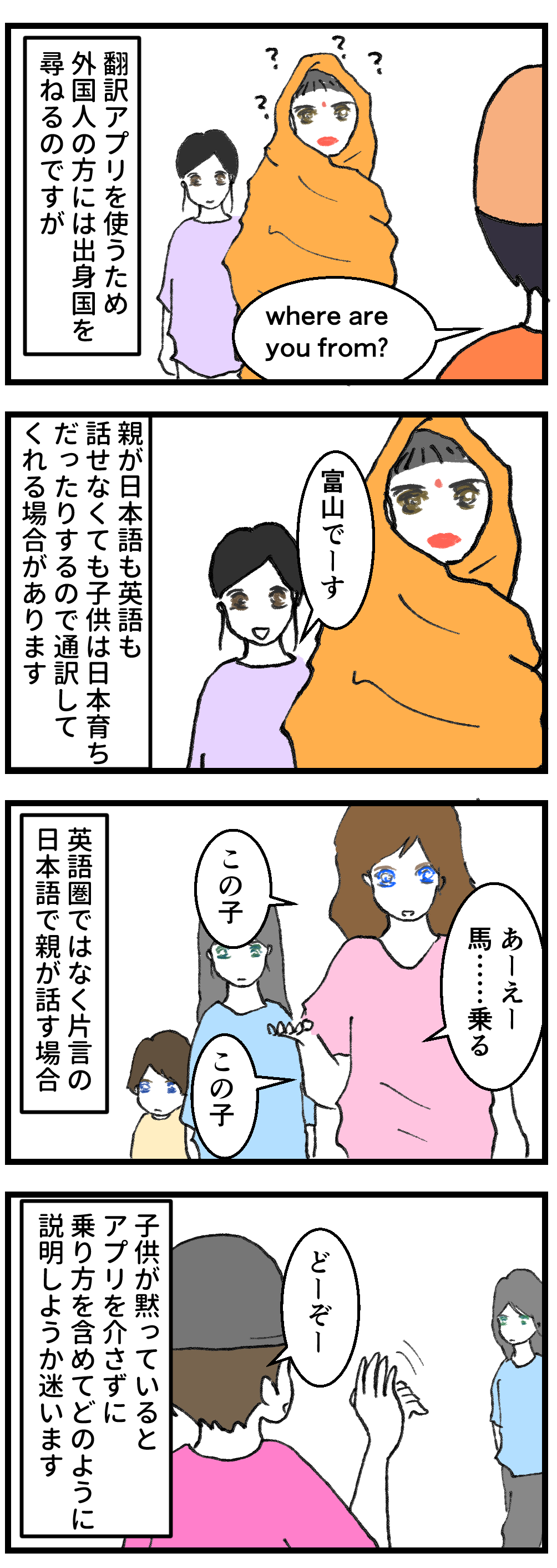 日本で暮らしている場合、父親は日本で仕事をしているためたいていは日本語を話せますが、母親はカタコトか、まったく日本語が話せないことがほとんど。