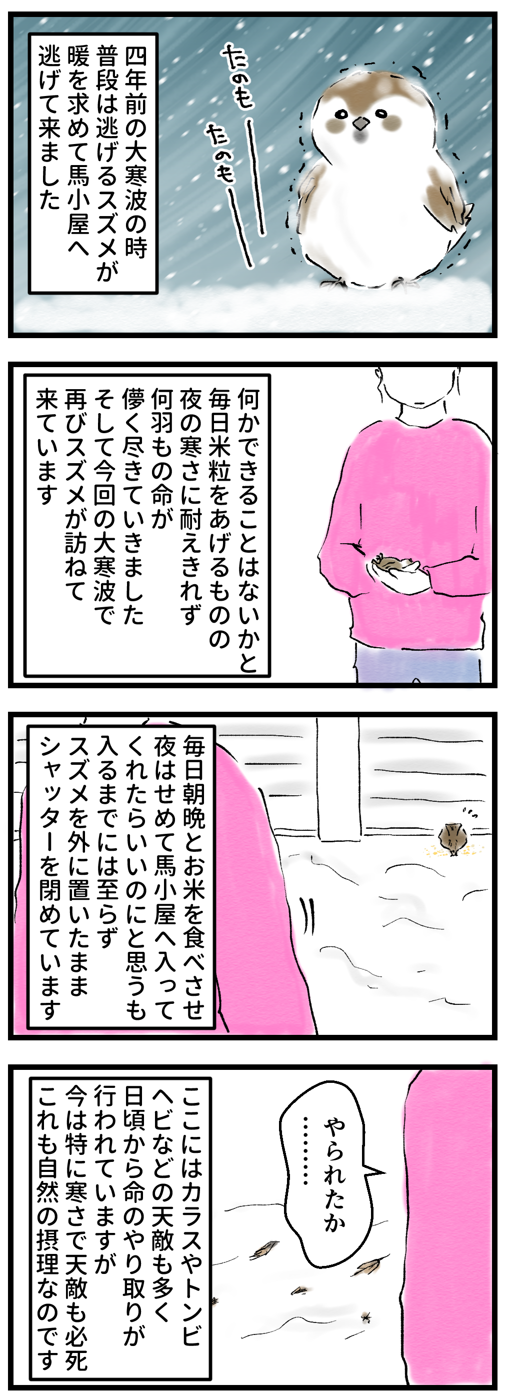 そのスズメたちも、連日の寒さが堪えるようで、厩舎のシャッターを開けると一羽だけ飛んでくるようになりました。