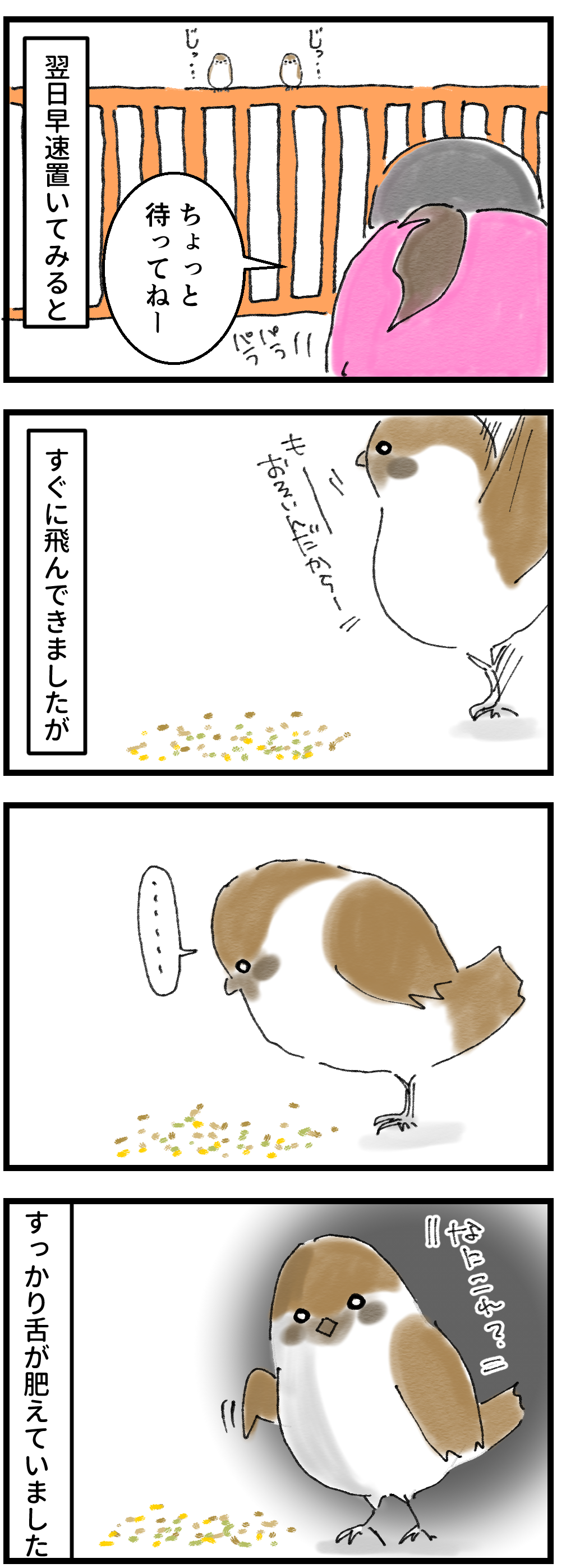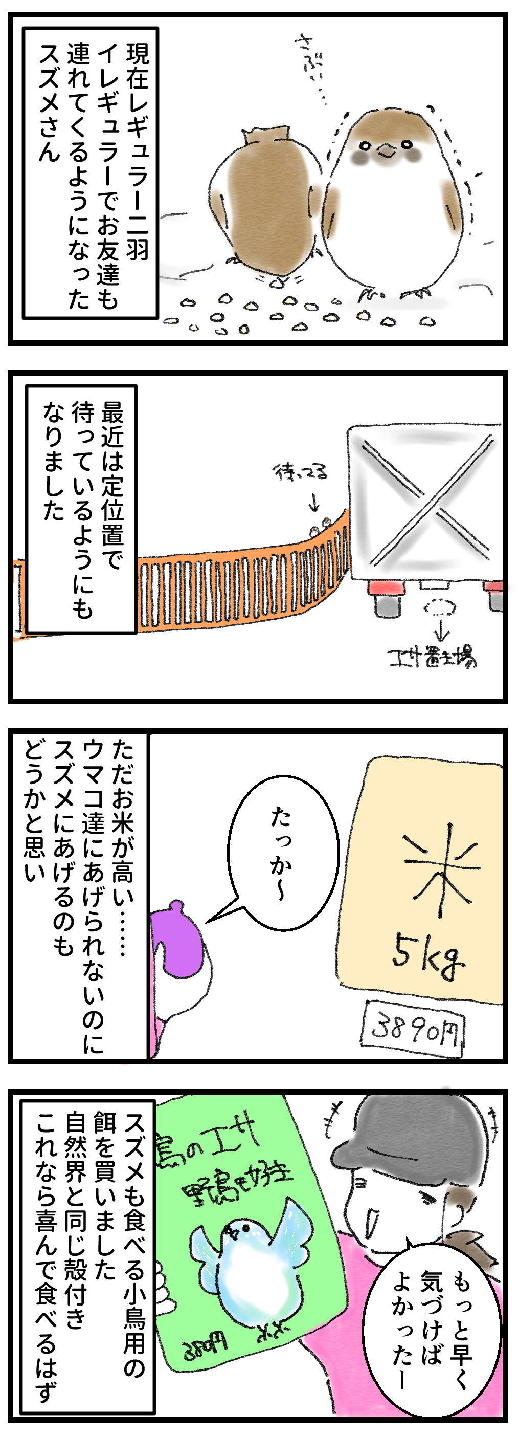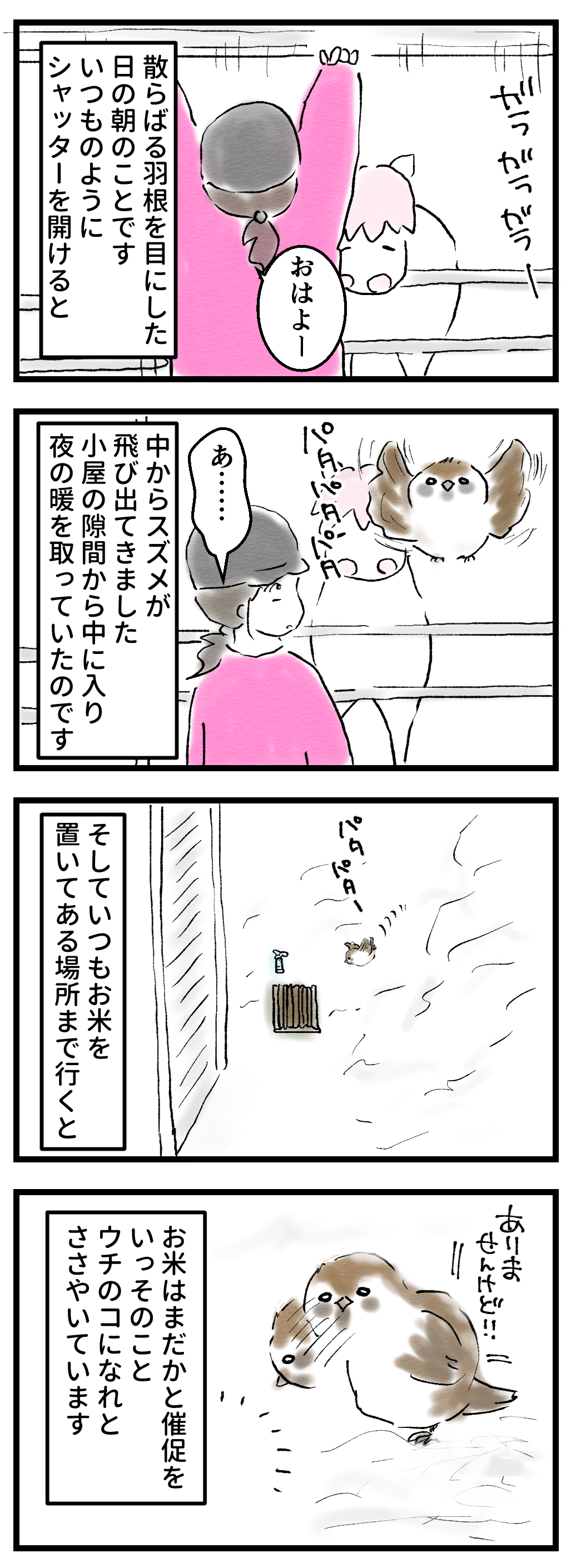 実は四年前の大寒波以来、餌が無くなる冬場はお米をあげるようにしていて、それを知っているスズメなのかもしれません。