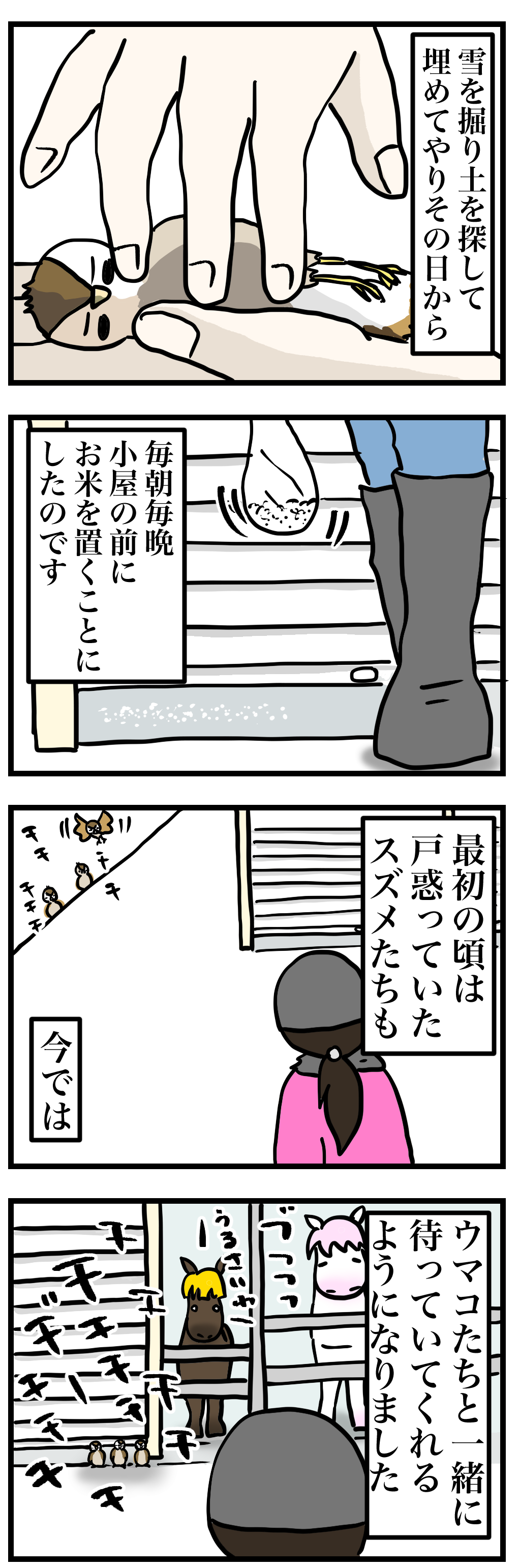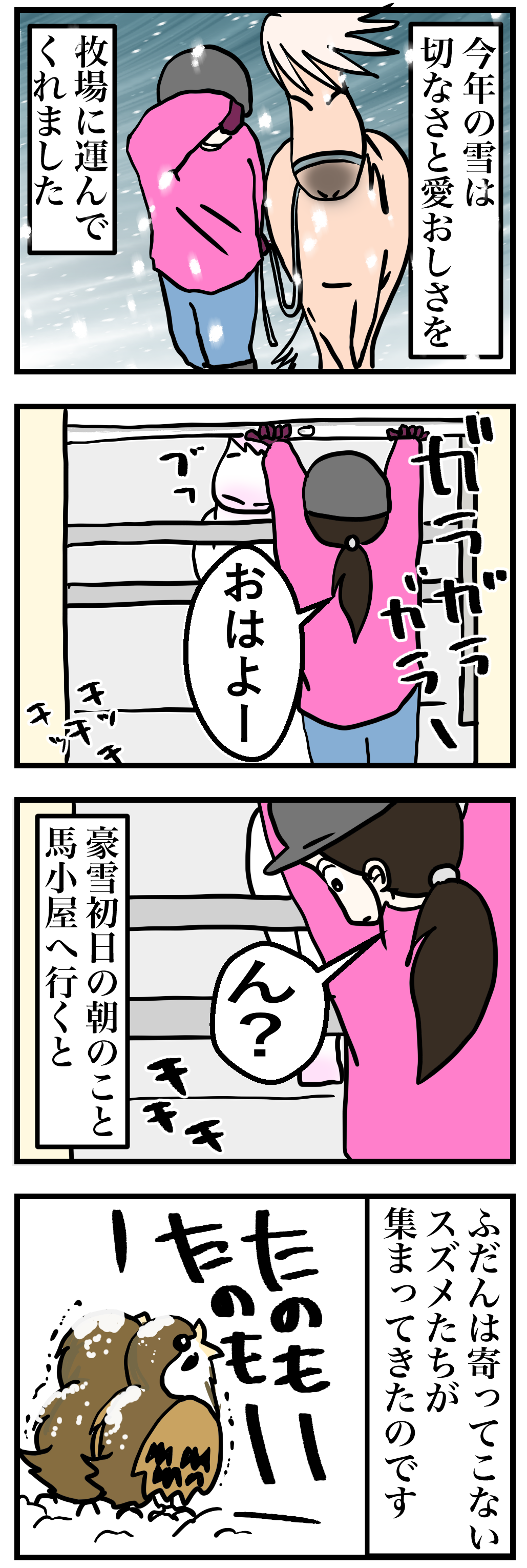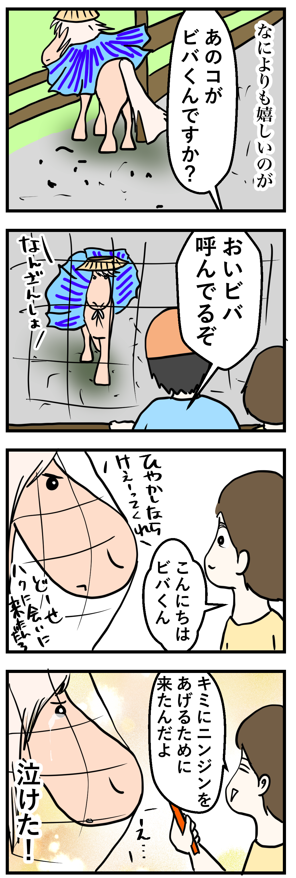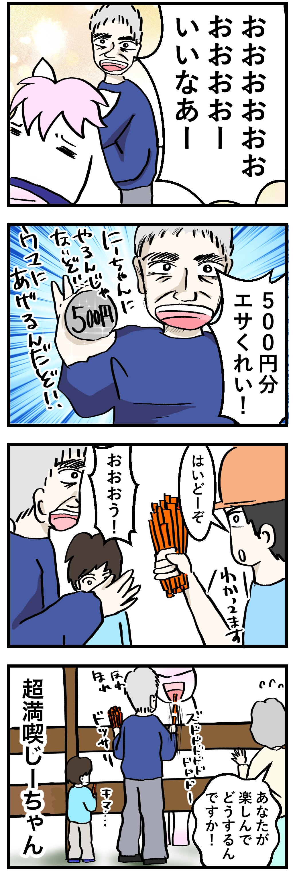昔北海道で乗った経験があったとか、とても懐かしいと喜んでハクちゃんに乗り、降りたら大量のニンジンを買われてエサやり体験を。