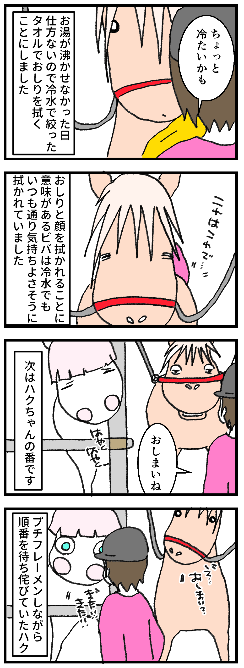 2026年01月03日 馬も温かいお風呂が好き そりゃそうだ元日から魚津は極寒です。こんな日は温かなタオルでお手入れをしてあげたいのですが、吹雪いていると構造上お湯をわかせないため、この日は仕方なくお水で絞ったタオルでお手入れをしたのです。いつものホカホカタオルだと思っていたのでしょう。喜びは半減していたようです。