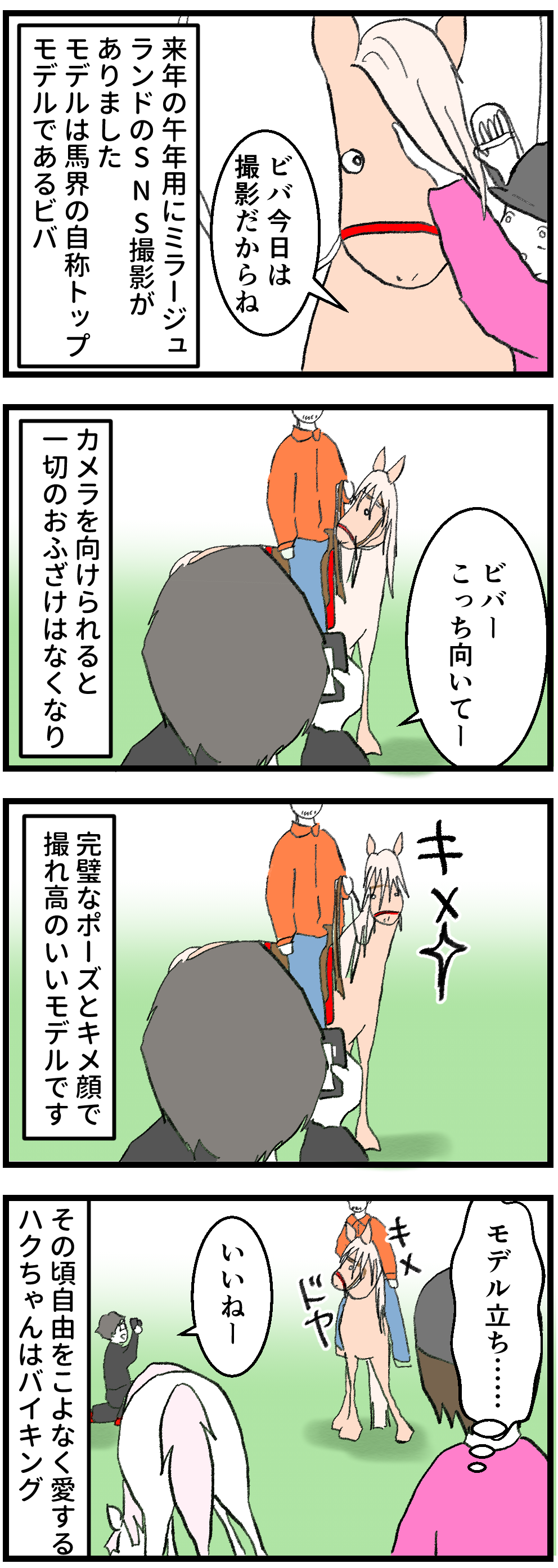 2025年12月21日 我が家のトップモデル 立派だ下に草があるのに顔を下げることなくジッとしている。これ、なかなかできないことだと思います。ビバのプロ魂は実に見事。カメラマンの指示にも確実に応え、美しいモデル立ちでカメラに目線を送る。そしてやりきったらご褒美を要求するところもプロならではです。2センチほどのクッキーを4分割した小さな小さなカケラをもらい、それで満足する様子を見ると愛おしさ全開。昔ボスが飼っていたサラベツオウという愛馬も名俳優馬でした。それを思い出すのでしょう。ボスにも褒められて満更ではないビバたんでした。