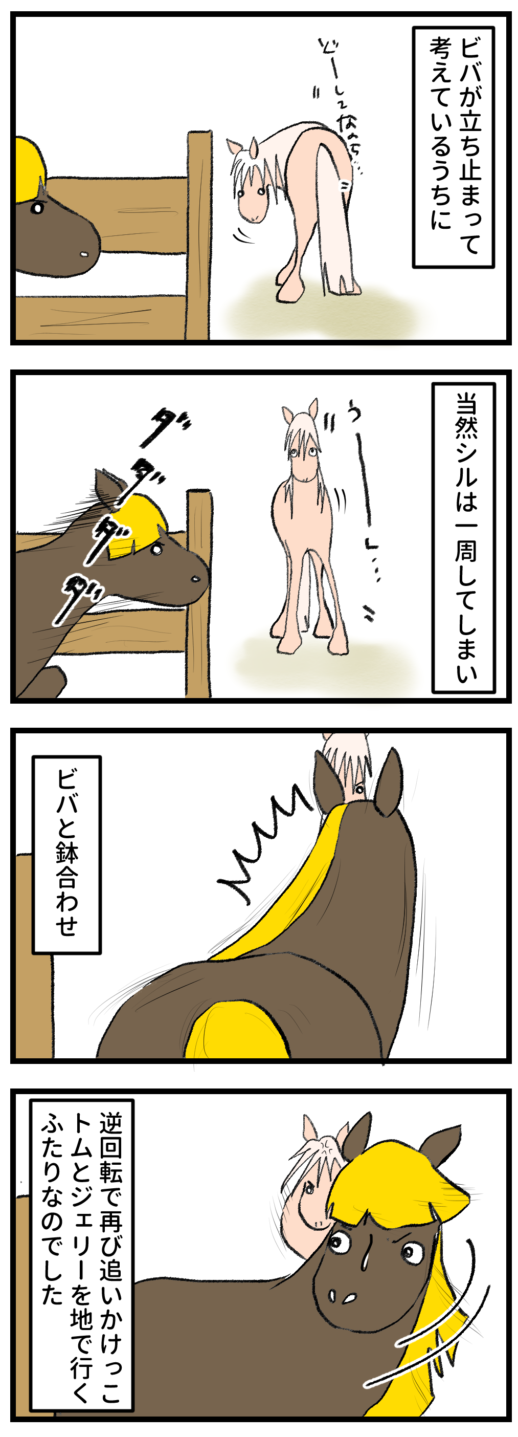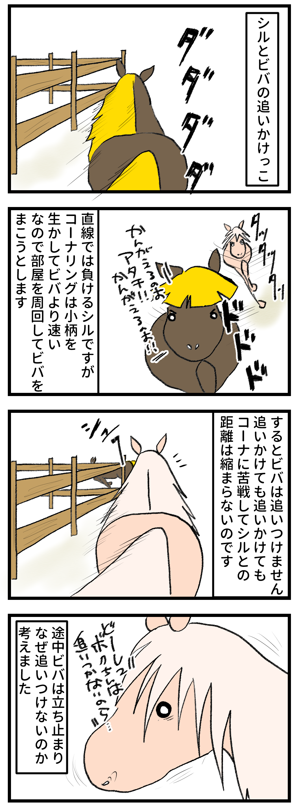 2026年02月18日 某有名漫画の再現 この関係は変わらなそう……シルは天然です。果てしなく天然すぎて、自爆が多い。そしてそんなところが余計にビバを刺激するのでしょう。それにしてもシルの運動能力はポテンシャルがあります。走る姿は本当に美しいのです。特にコーナーを曲がる時などは無駄のない最小限のコーナリングで速い速い。ビバを見事にまいていくのです。でもひとつのことしか見てないのでこのような結果にもなってしまうのでした。