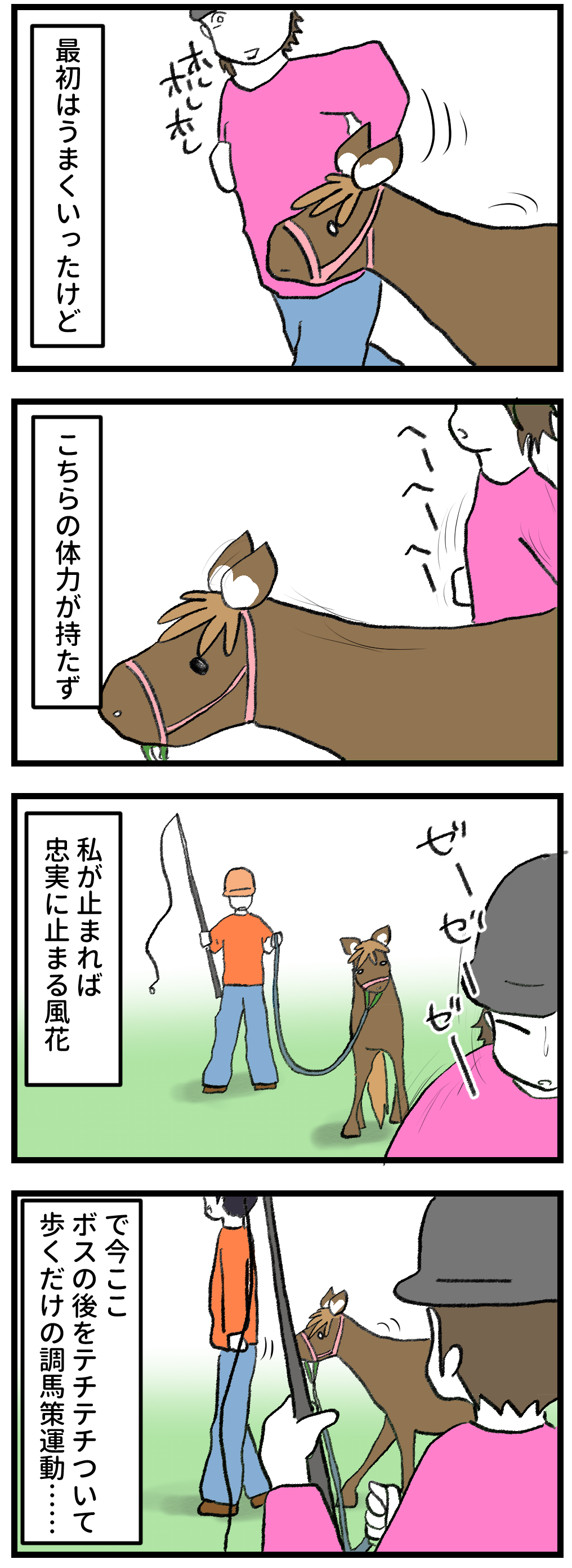 今も放牧しても一瞬走るだけ。他のコたちも最近運動会しないので、まったく走らないこともあり、やや運動不足気味。