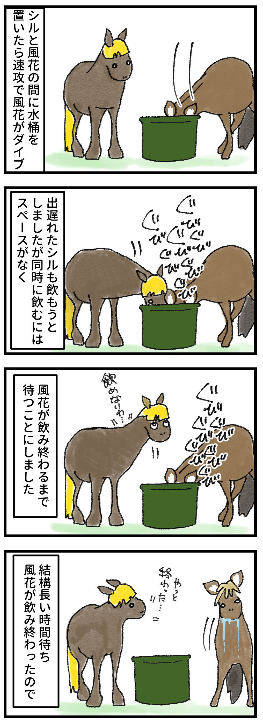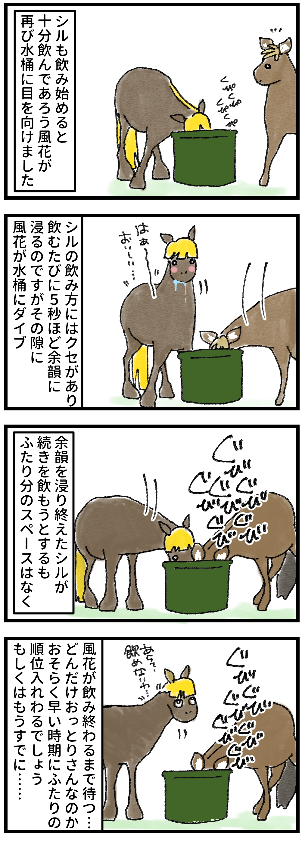 2025年03月22日 水の飲み方が癖強めな馬 ワザとじゃないよね?毎日毎日確実に成長し続ける風花ちゃん。おとなしめな子かな、と思っていましたがまあまあユニーク。将来が楽しみで仕方がありませんが、なるべく美しいもの、楽しいこと、仲良しなことなど善いものを見て大人になって欲しい……。