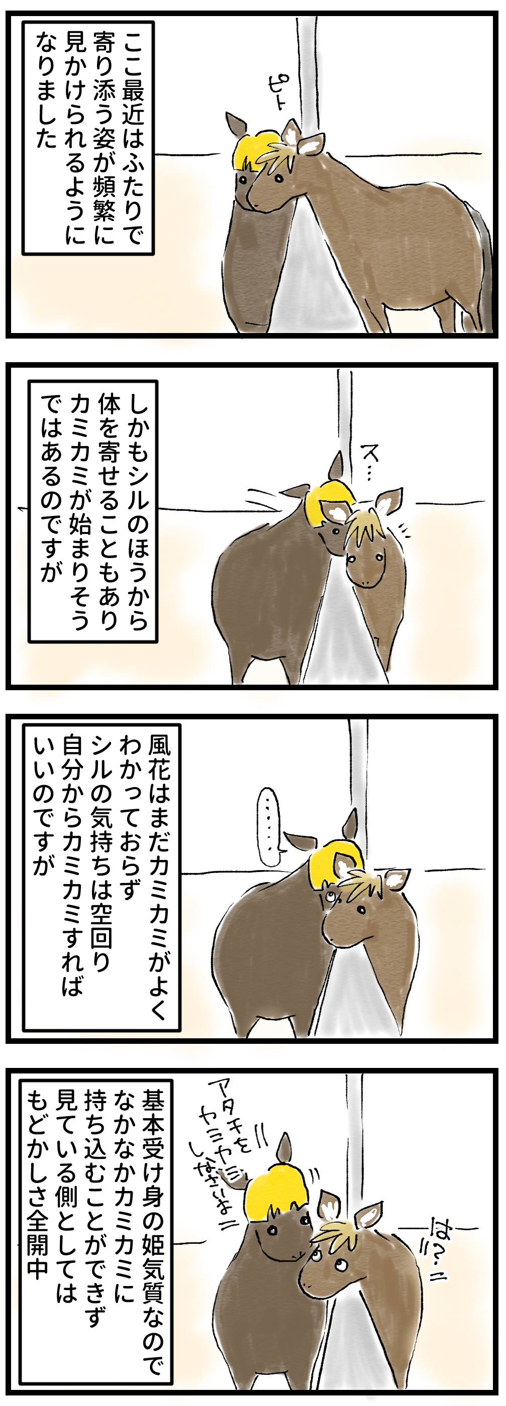 2025年02月02日 シル姫のしたいこと ちょっとずつ前進来た当初に比べたら本当に仲良しになったシルと風花。朝はふたり寄り添う姿を見られるようにもなりました。あとはもう少しシルがお姉ちゃんになって先導してくれたら、馬としてのコミュニケーションを上手に取れるようになる気がします。