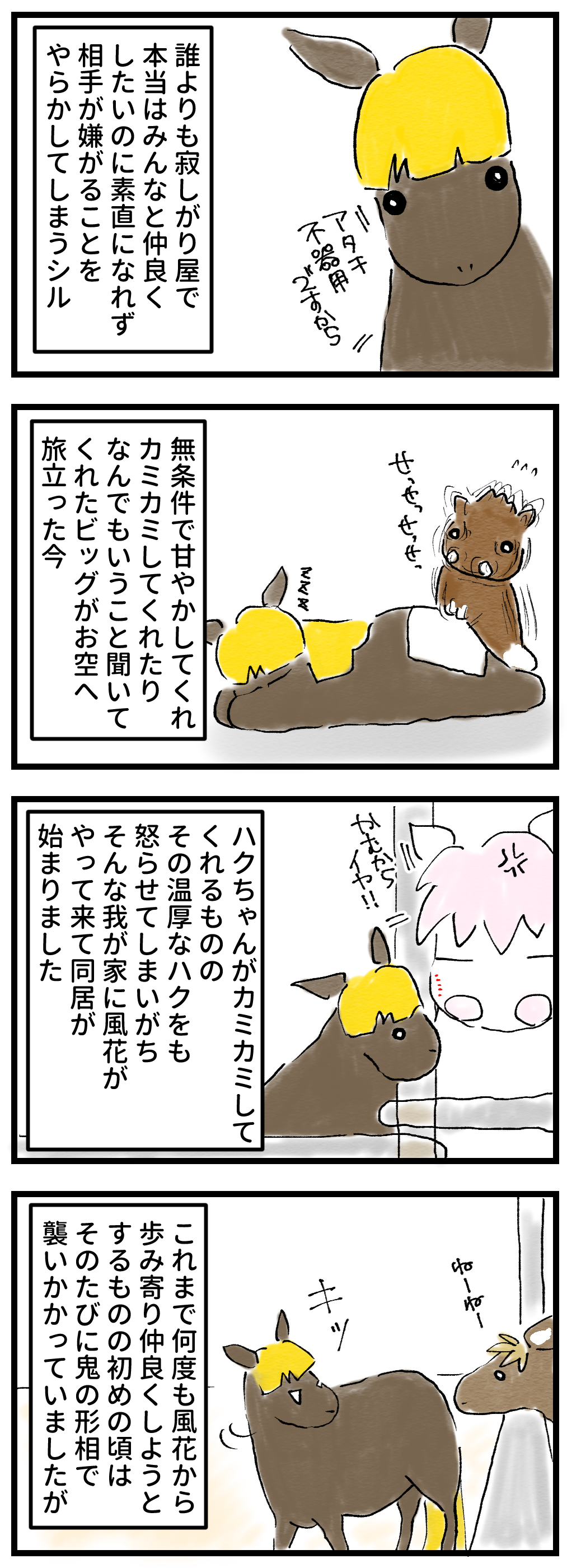2025年01月31日 仔馬の学習能力 常に見られてる……誰よりもプレッシャーに感じてるのは私です。ウマコたちはなぁんにも考えず、これまで通りの対応ですが、変な誤解(どんな笑)を与えないよう常にドキドキしています。何故かって。風花の吸収力はスポンジ並みだから。とりあえず今は楽しい記憶をたくさん作ってあげたいと考えています。