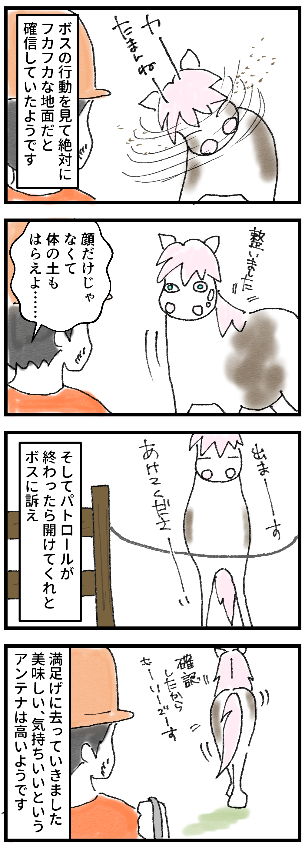 2025年03月19日 観察魔ハクちゃんのパトロール 全部見られてるハクちゃんの観察力が成せるワザ。しかもボスに怒られないよう影からそっと様子をうかがい、終わった頃に入りたいという意思表示をするのは見事です。ボスと暮らすうちに自然と身についたワザなのでしょう。そしてふかふかの土を堪能したらもう用はなく、再び外に遊びに行く自由すぎるハクちゃんなのでした。