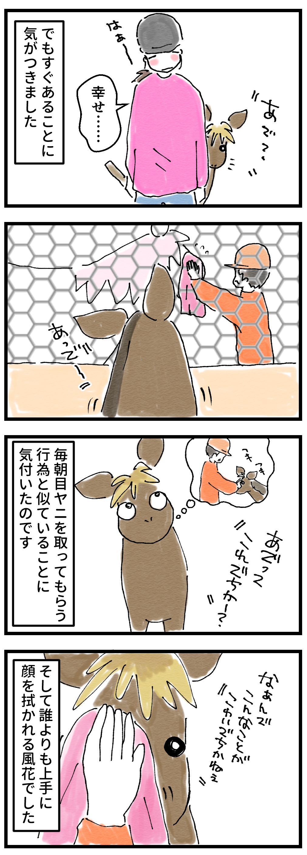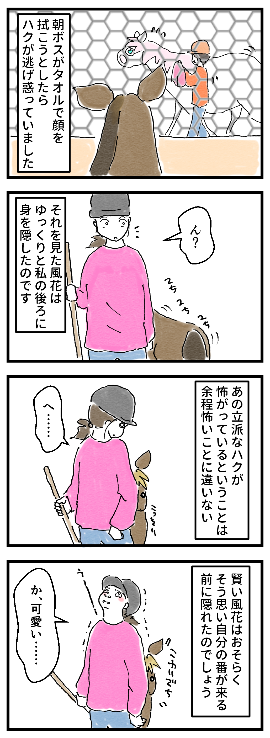 2025年04月03日 自由気ままに成長中の仔馬 やはり大物感が……別に悪さをするわけでもなく、シルの邪魔をすることなく適度に懐く風花は気にならないのか。いとも簡単にシルのパーソナルスペースに侵入します。そして飽きたら帰る……。もう仕切りはいらないのでは、と思うのですが、エサやり体験の仕事が入れば確実に地獄を見るので、仕切りは必須。ゴールデンウィーク前には牧場の部屋は大改造され、均等に四等分される予定。それまでは謎の気まぐれ同居が続きます。