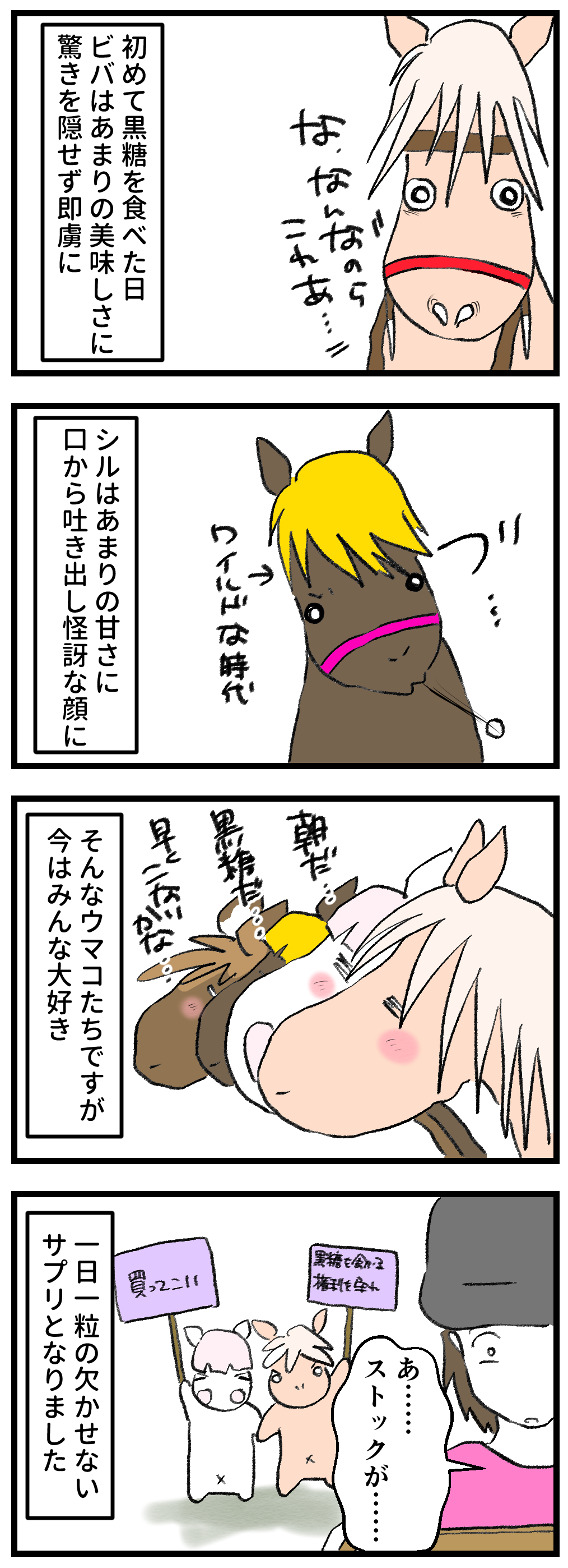 我が家では、一粒の黒糖を半分にして2回に分けてあげています。その片割れがものすごく小さくなってしまう場合もあり、それも指でつまんであげているのでウマコたちが気を遣ってそっと唇だけで受け取るのです。