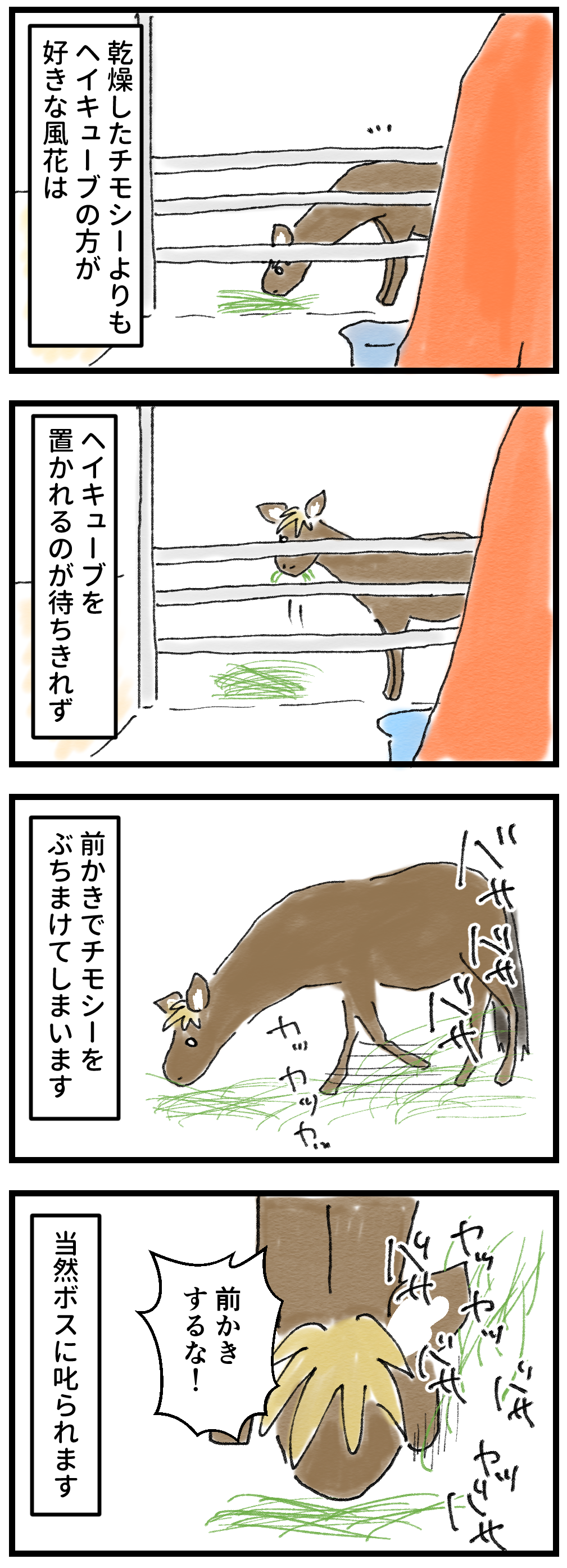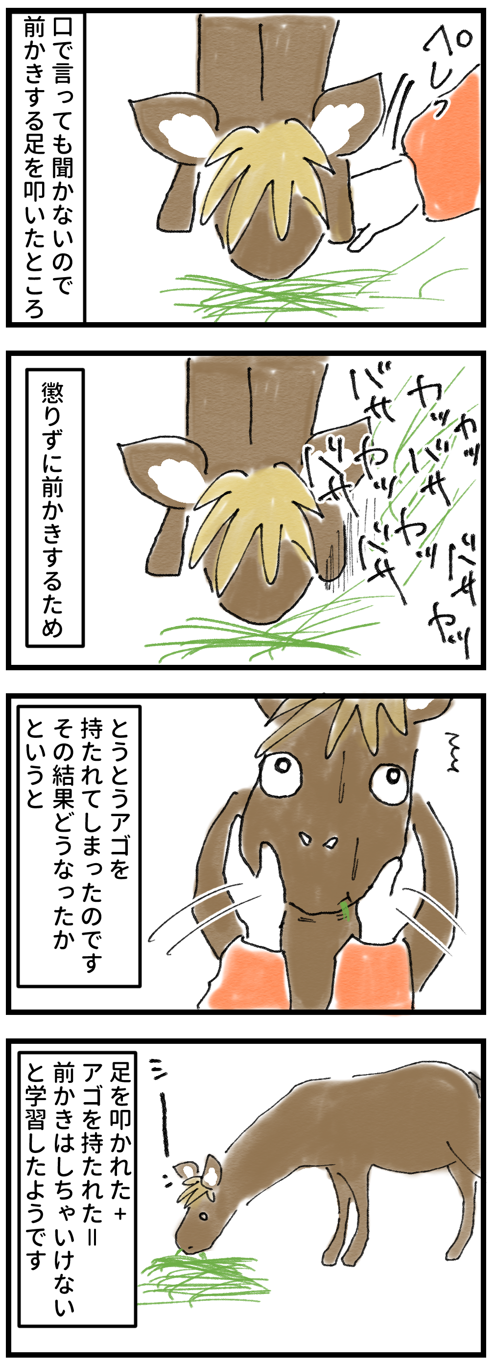 2025年02月19日 風花の前かきをやめさせたい場合 翌日はまた前かきでぶち撒ける……どうやら点と点を結んで線で考えることができるタイプのようです。が、翌日はまた振り出しに戻る。そりゃ一回で自制心が働くほど聞き分けがいい分けがありませんね。前かきの達人(ビバ)がいる限り、しなくなることはないでしょうが、チモシーをぶち撒けるのだけはやめて欲しい。